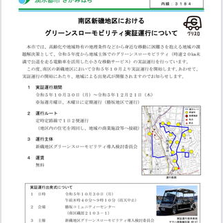 本市では、高齢化や地域特有の地理条件などから身近な移動に困難さを抱える地域の課 題解決策として、令和5年度から地域主体でのグリーンスローモビリティ(時速20km未 満で公道を走る電動車を活用した小さな移動サービス)の実証運行を行っています。